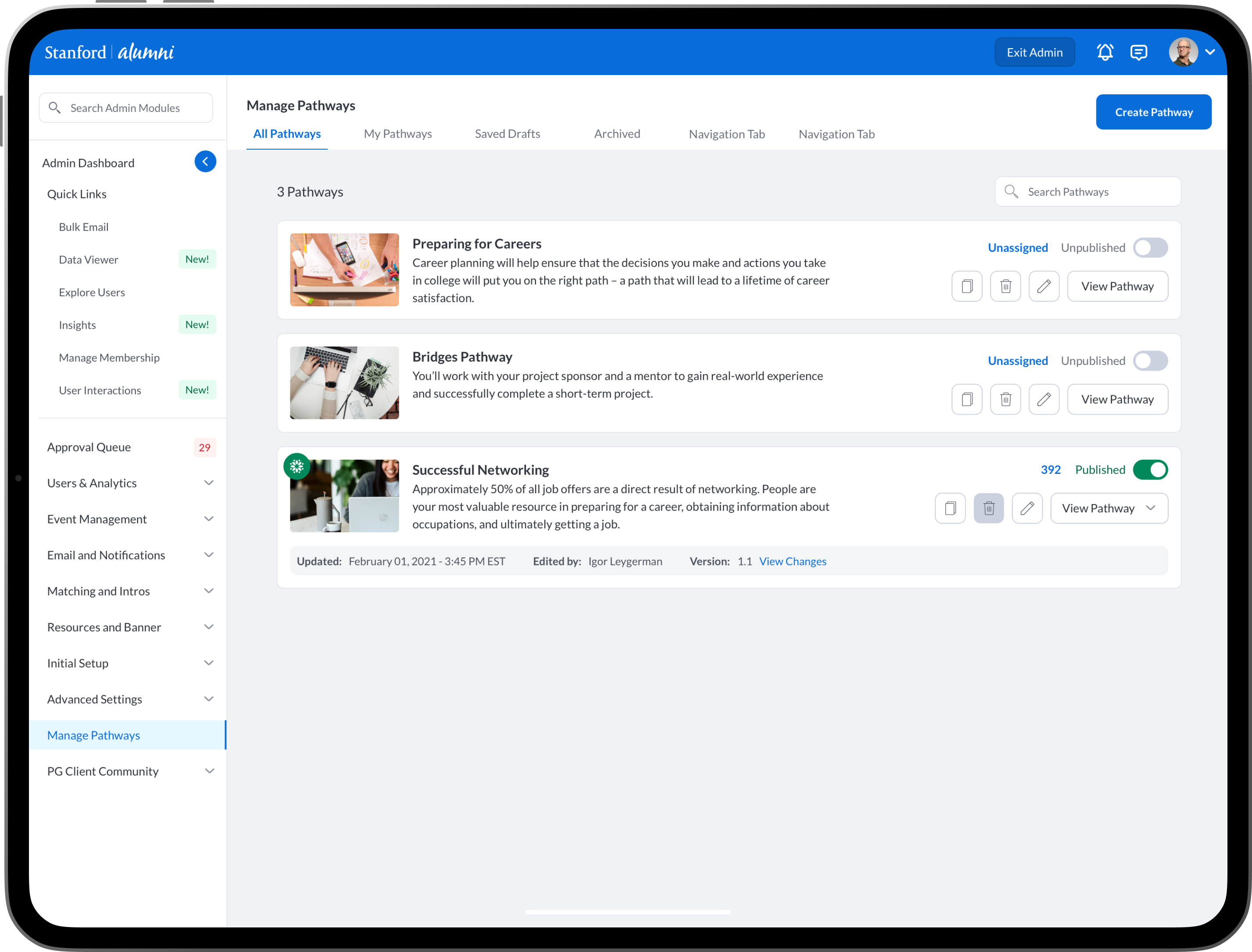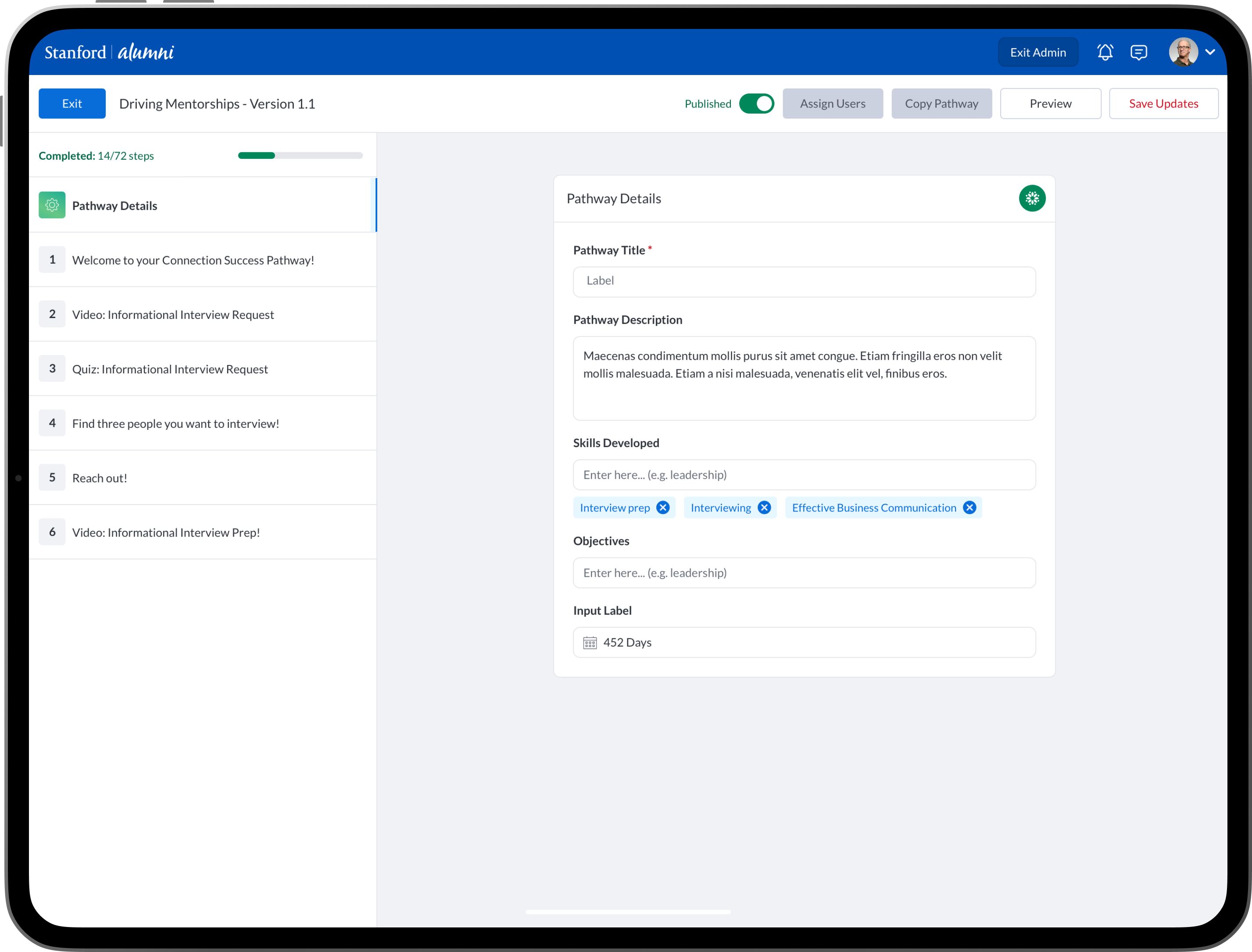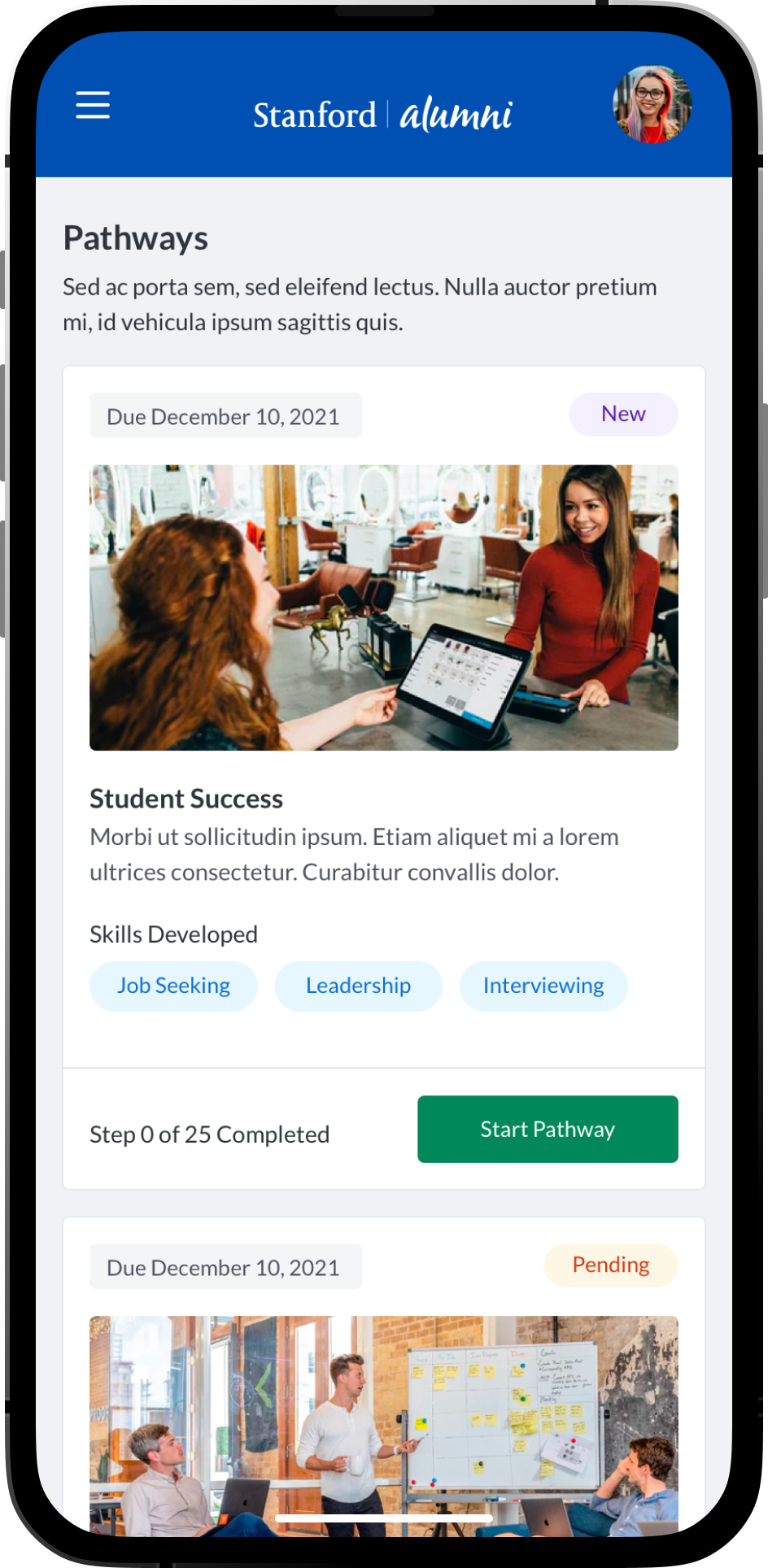 Pathways was a new premium product within the PeopleGrove ecosystem. Pathways empowered higher education / university students, alumni, mentors, staff, advisors and mentees a product with features aimed at fostering personal, academic, and professional growth. Pathways allowed faculty, staff, professors, advisors and alumni to create customized goals, tasks, meetings, conversations and many engaging features to help mentees find mentors.
