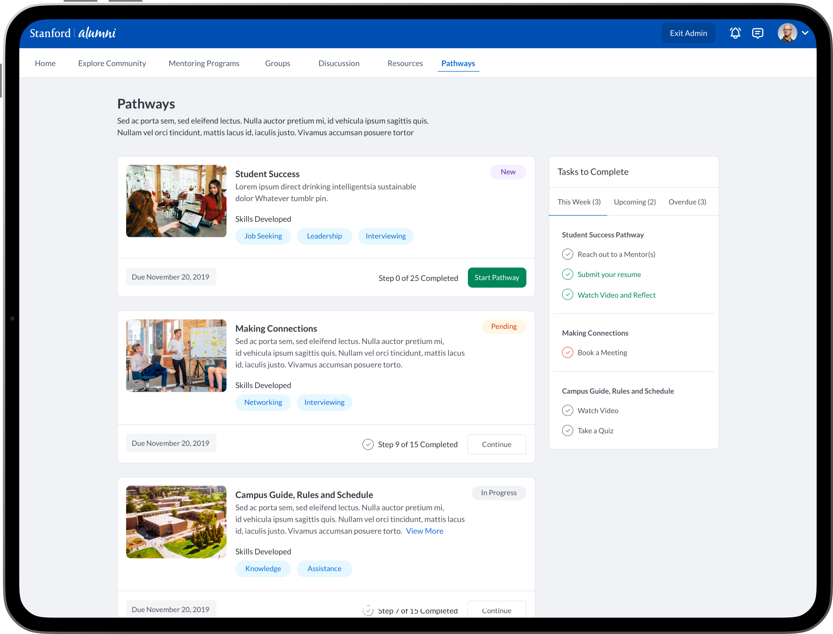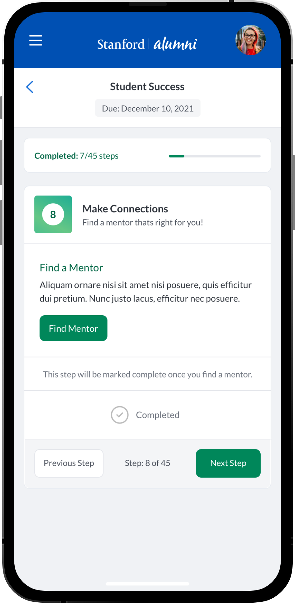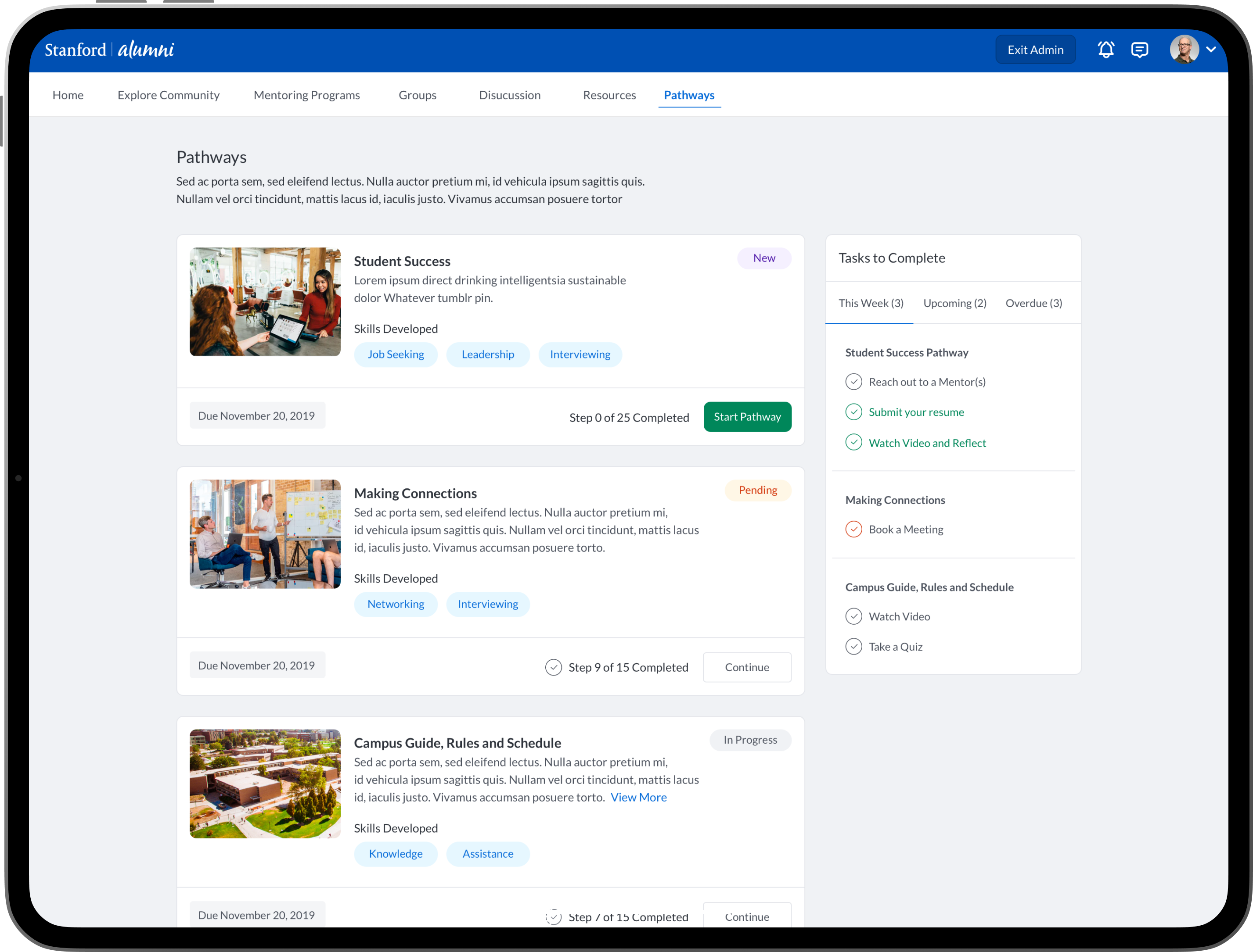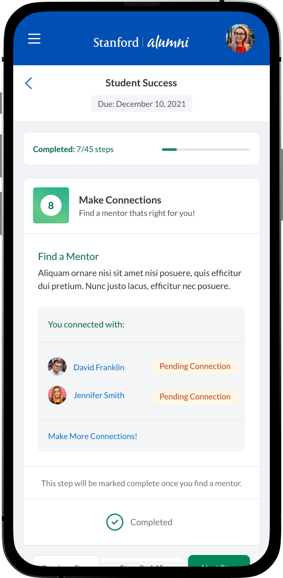 An intuitive task management system where students, mentees, mentors and alumni can view and manage academic, career-related, and personal development tasks. Integration with academic calendars, in-app chat integrations and conversation threads. Alumni could have relevant post-graduation tasks. Additional features such as: Resume review and feedback, Meeting Scheduling and Management, Interactive Quiz’s and Assessments, Mentor Discovery and Connections, Graduation Prep, Career Exploration and Preparation.