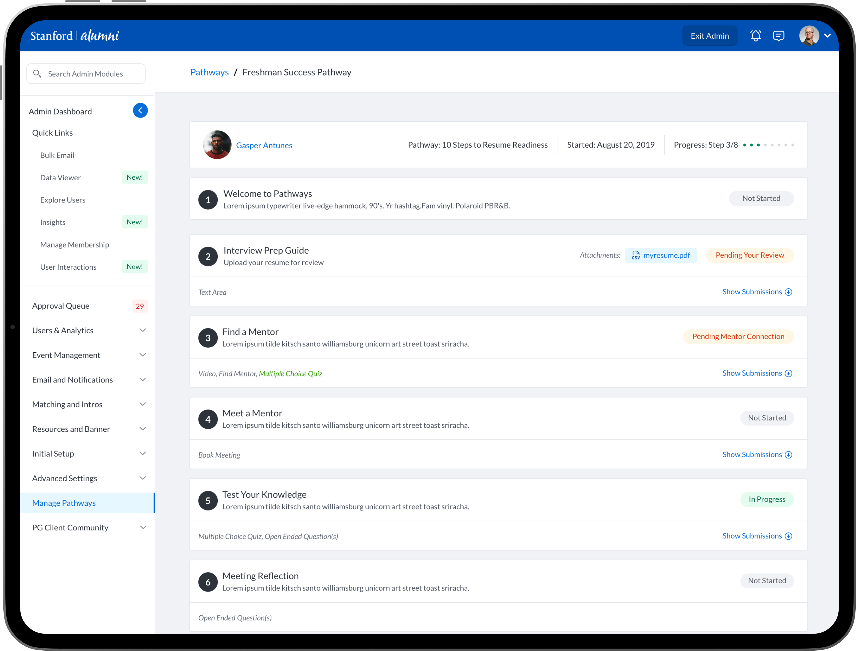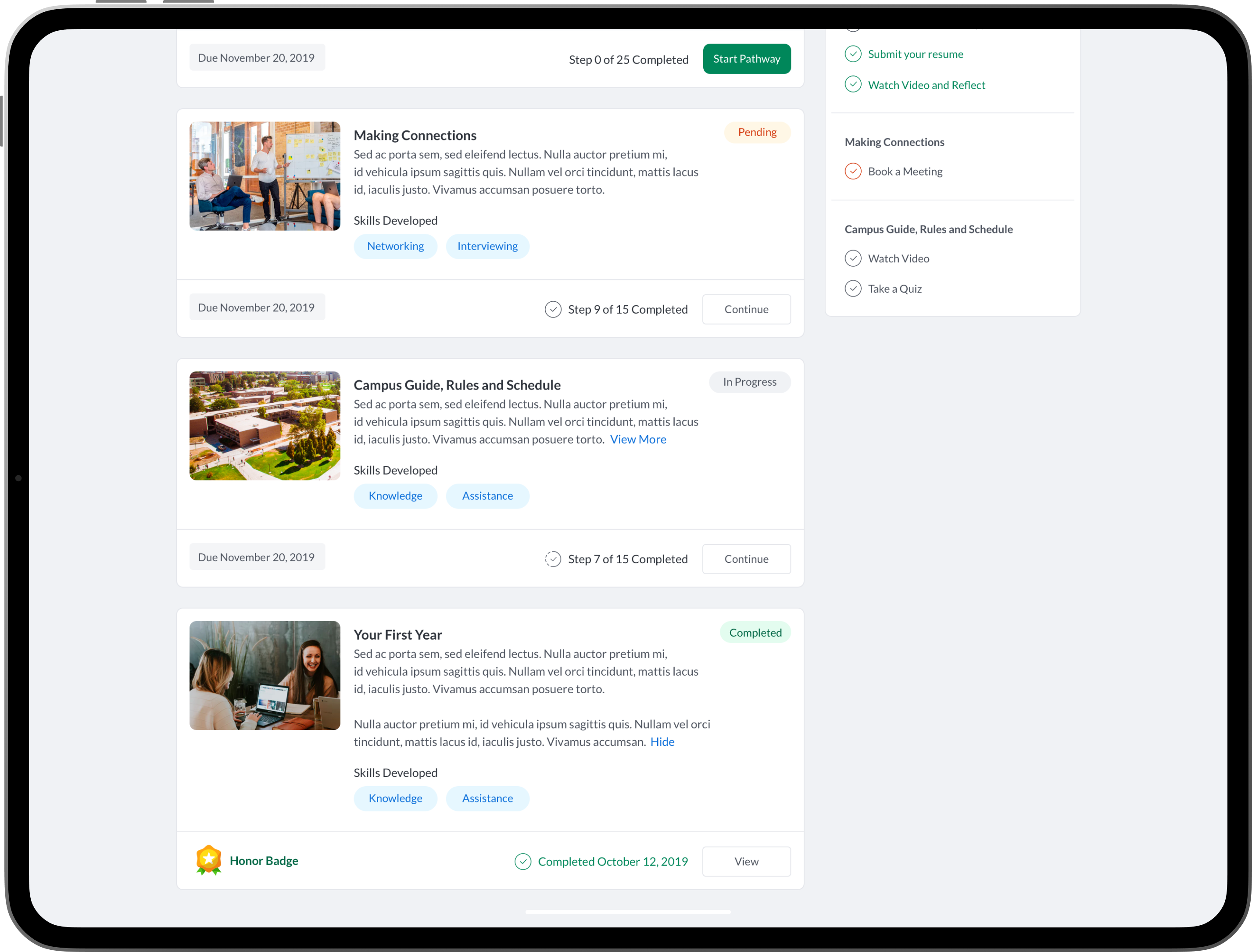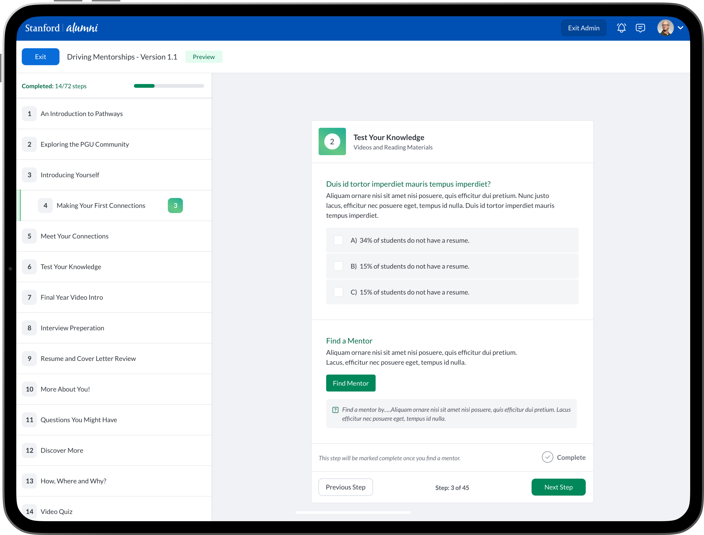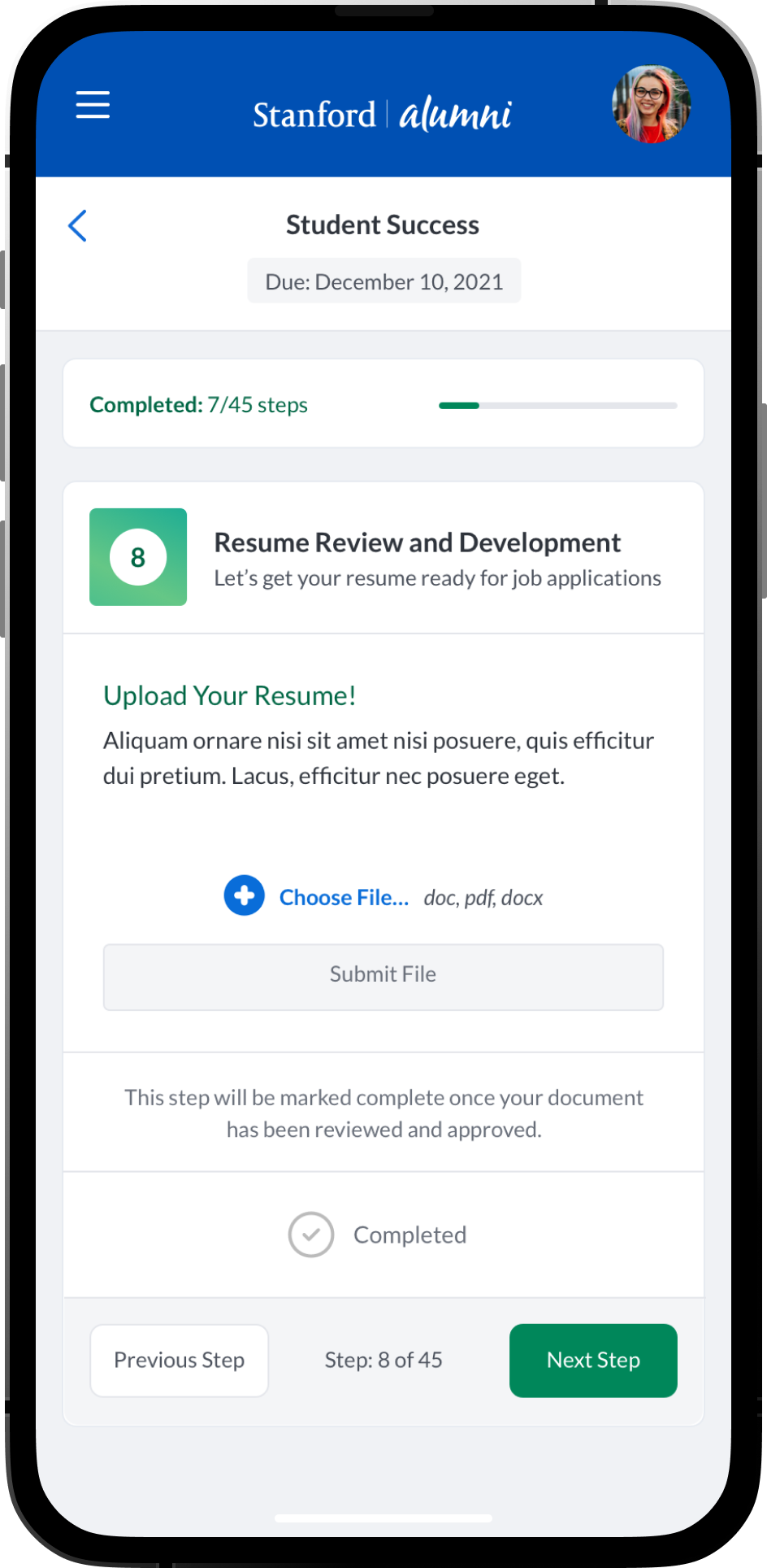 An intuitive task management system where students, mentees, mentors and alumni can view and manage academic, career-related, and personal development tasks. Integration with academic calendars, in-app chat integrations and conversation threads. Alumni could have relevant post-graduation tasks. Additional features such as: Resume review and feedback, Meeting Scheduling and Management, Interactive Quiz’s and Assessments, Mentor Discovery and Connections, Graduation Prep, Career Exploration and Preparation.