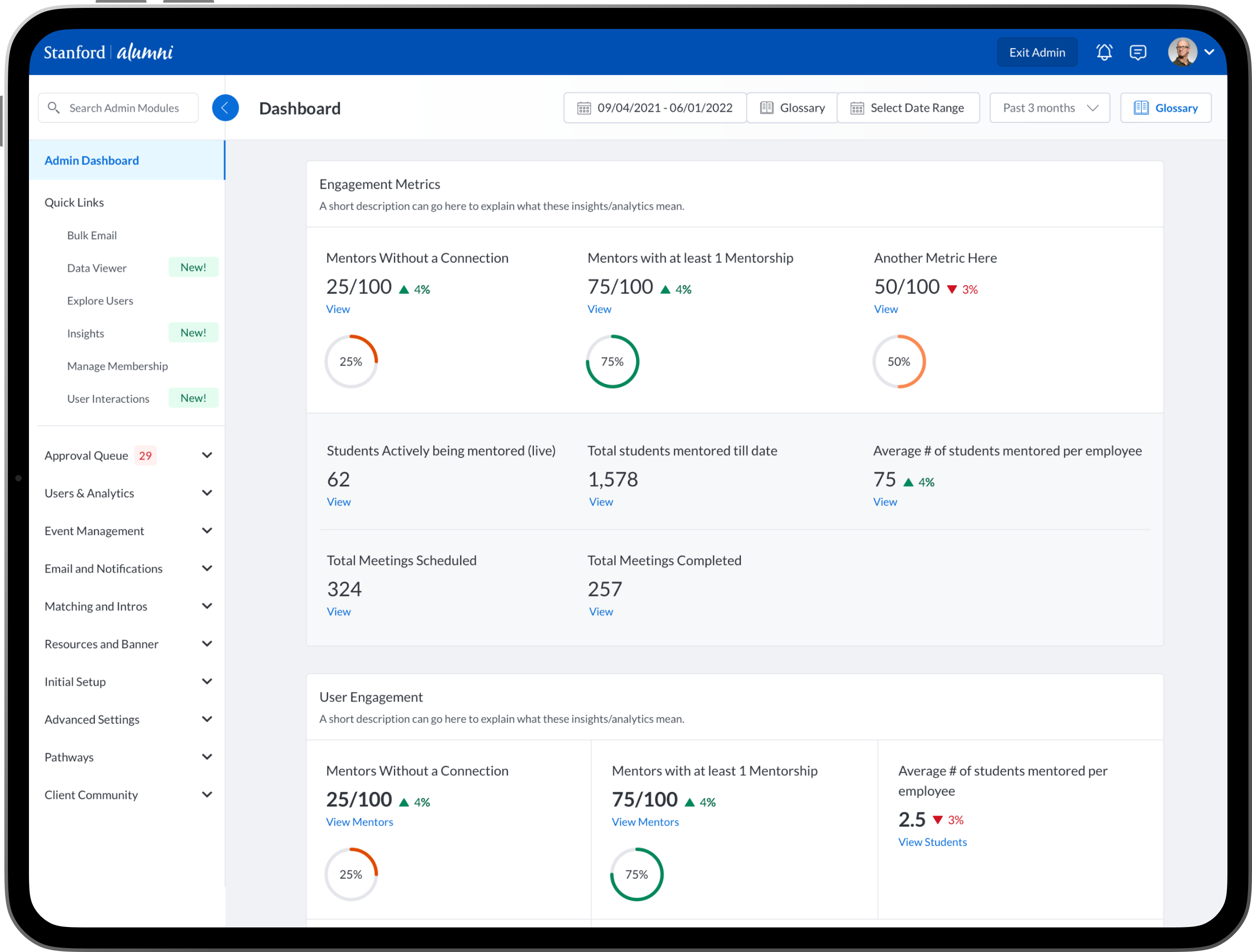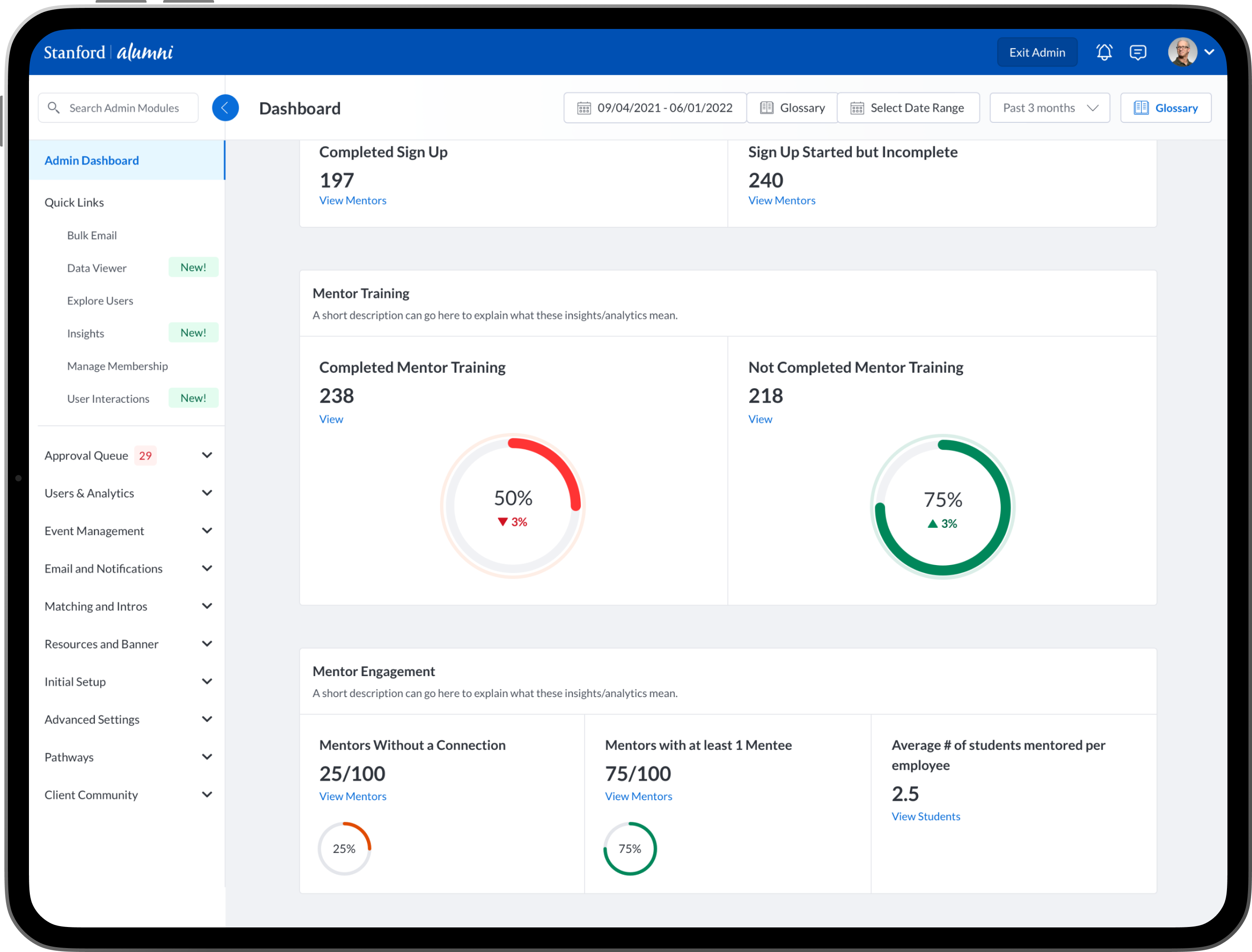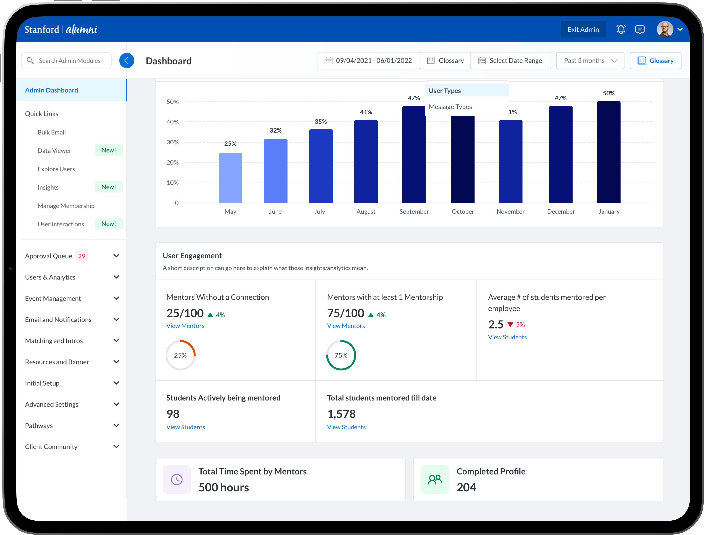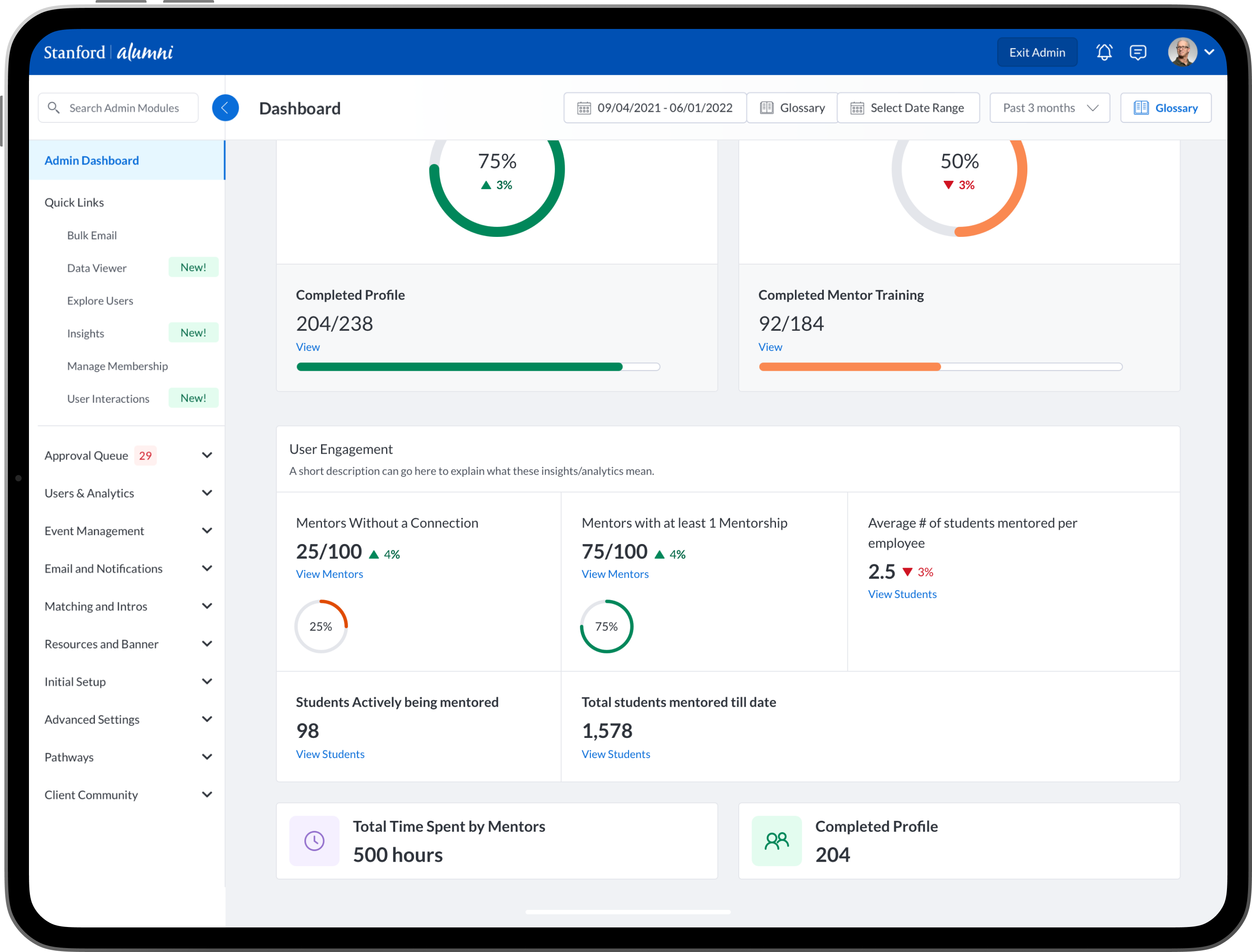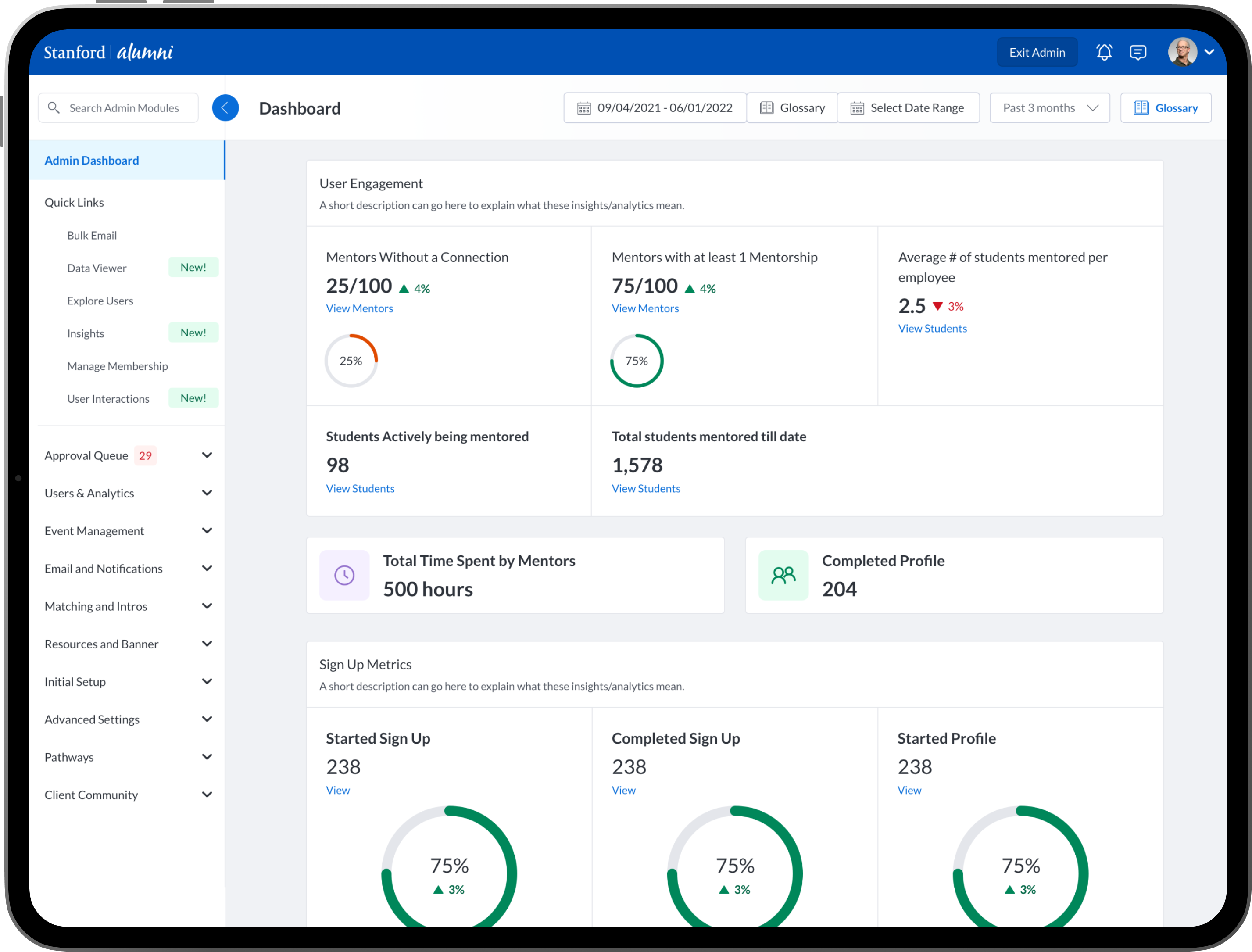 To design new dashboards that provide university/college administrators, advisors, professors, faculty and staff the ability to see insights into community engagement and activity between mentors, mentees, alumni, students, professors and advisors.