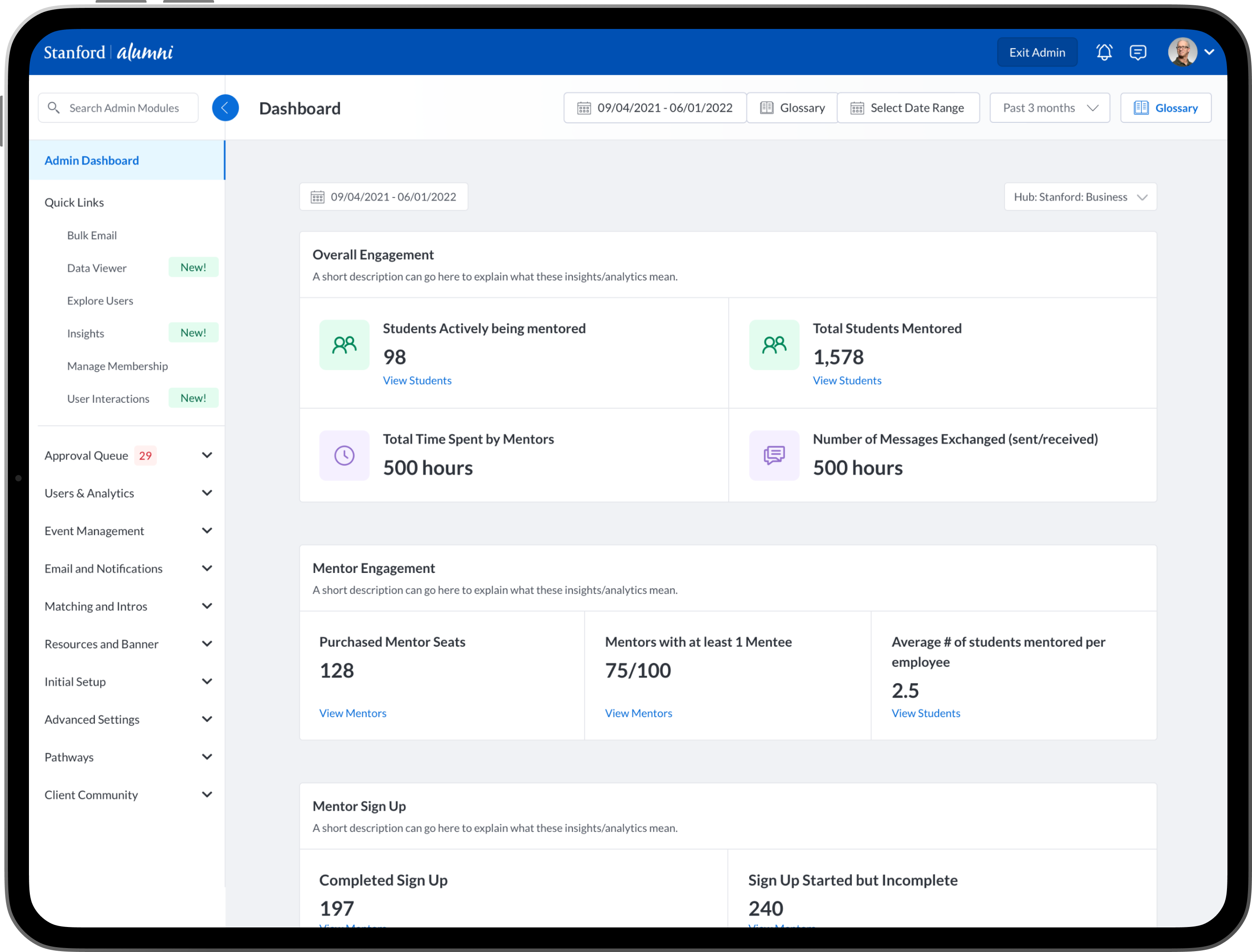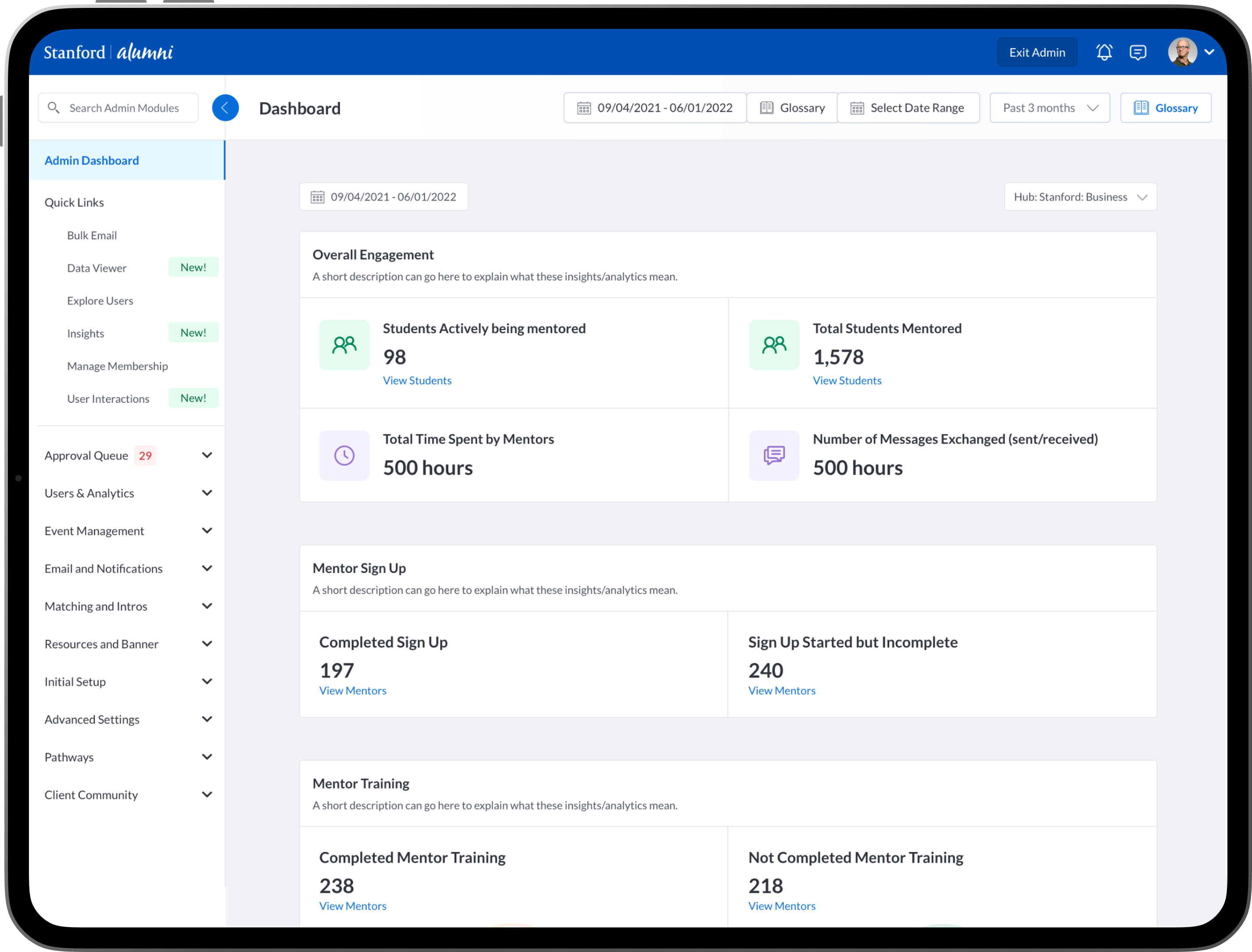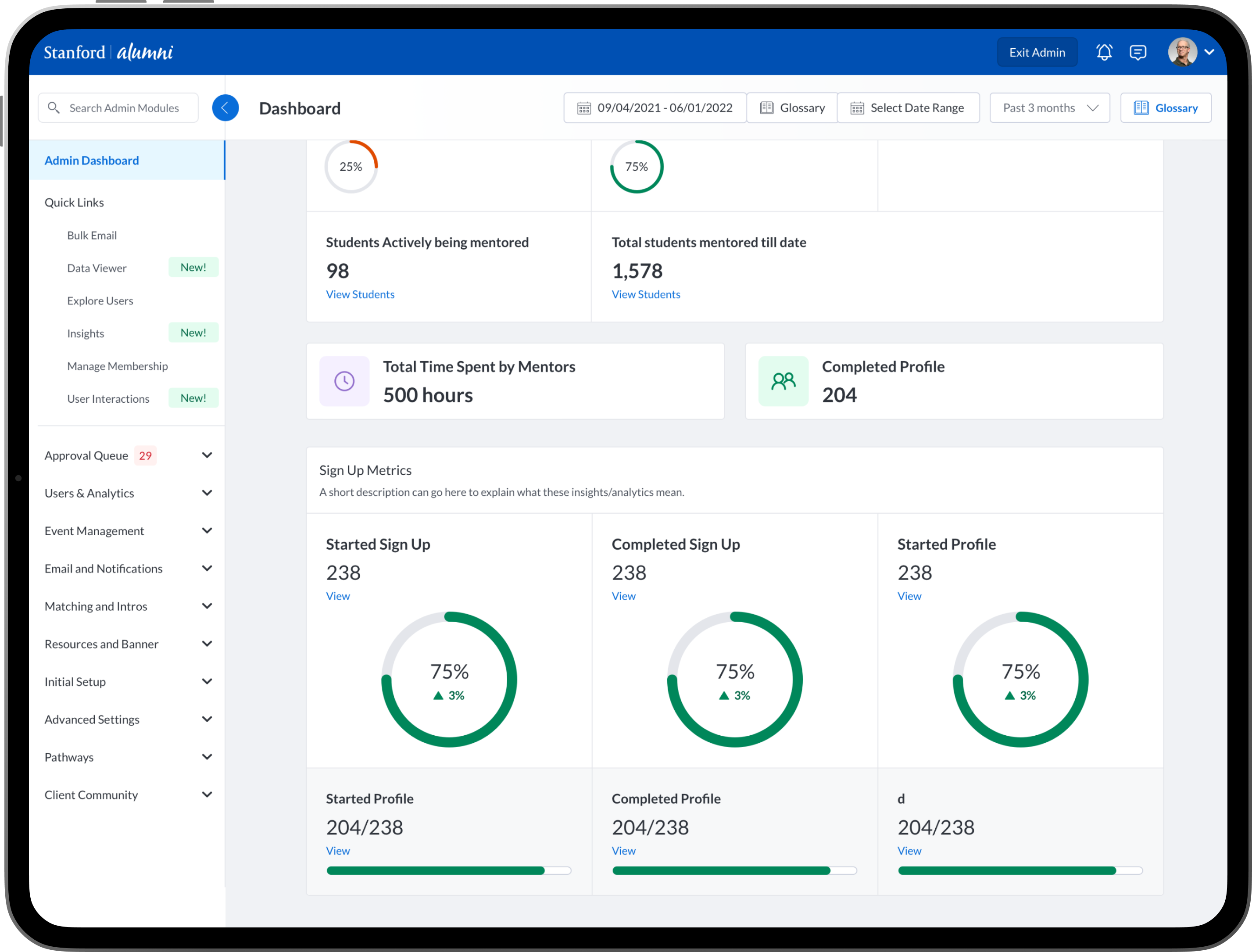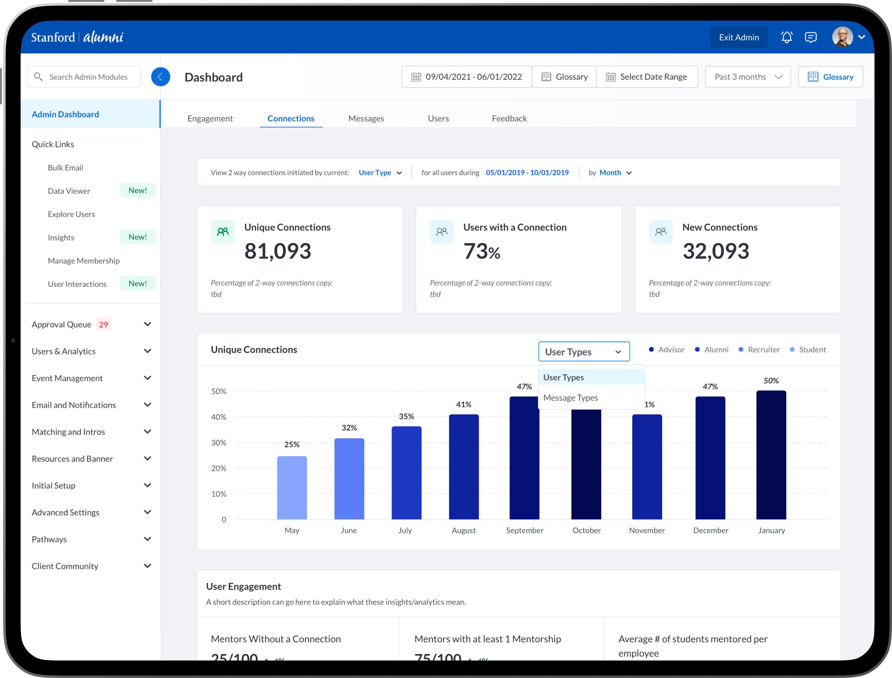 To design new dashboards that provide university/college administrators, advisors, professors, faculty and staff the ability to see insights into community engagement and activity between mentors, mentees, alumni, students, professors and advisors.