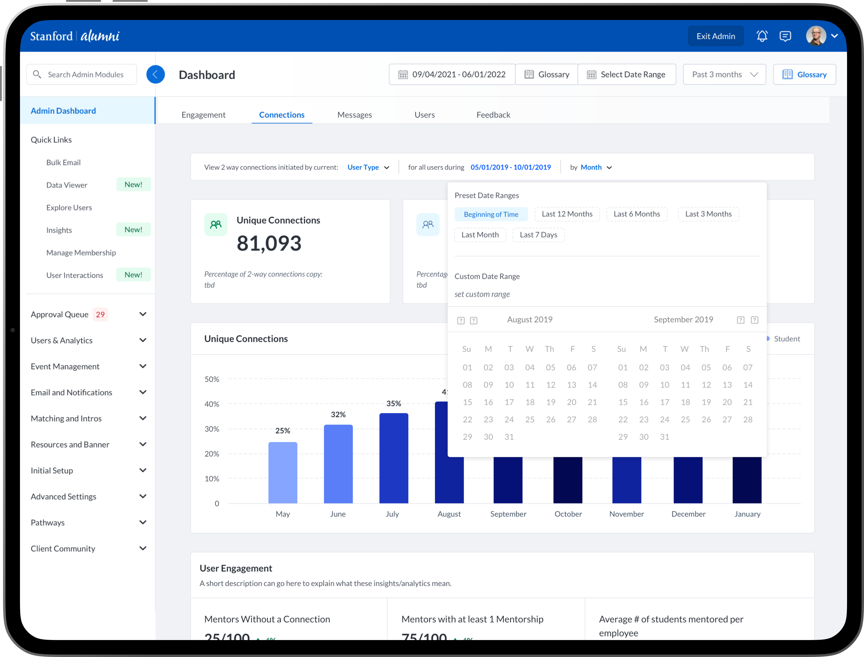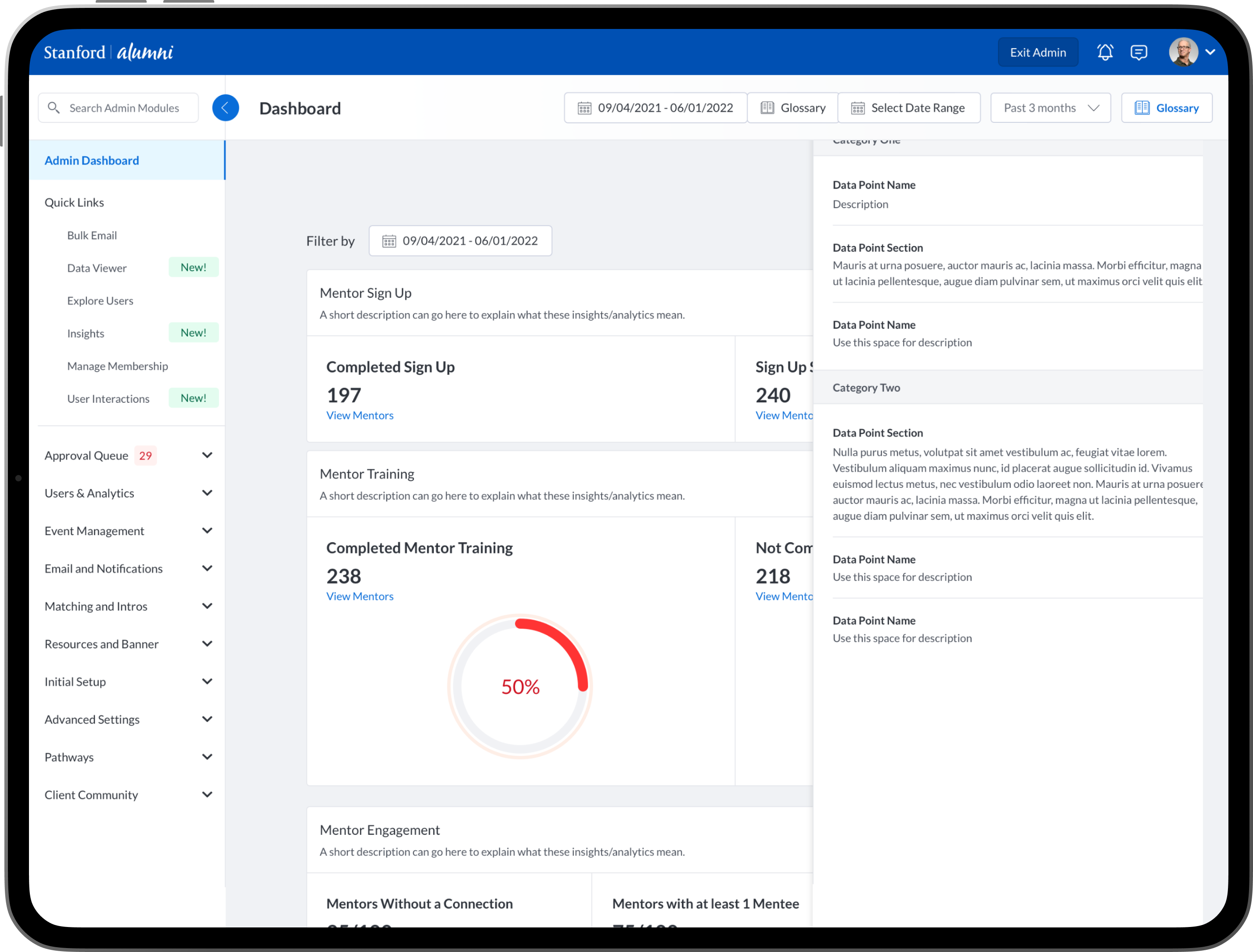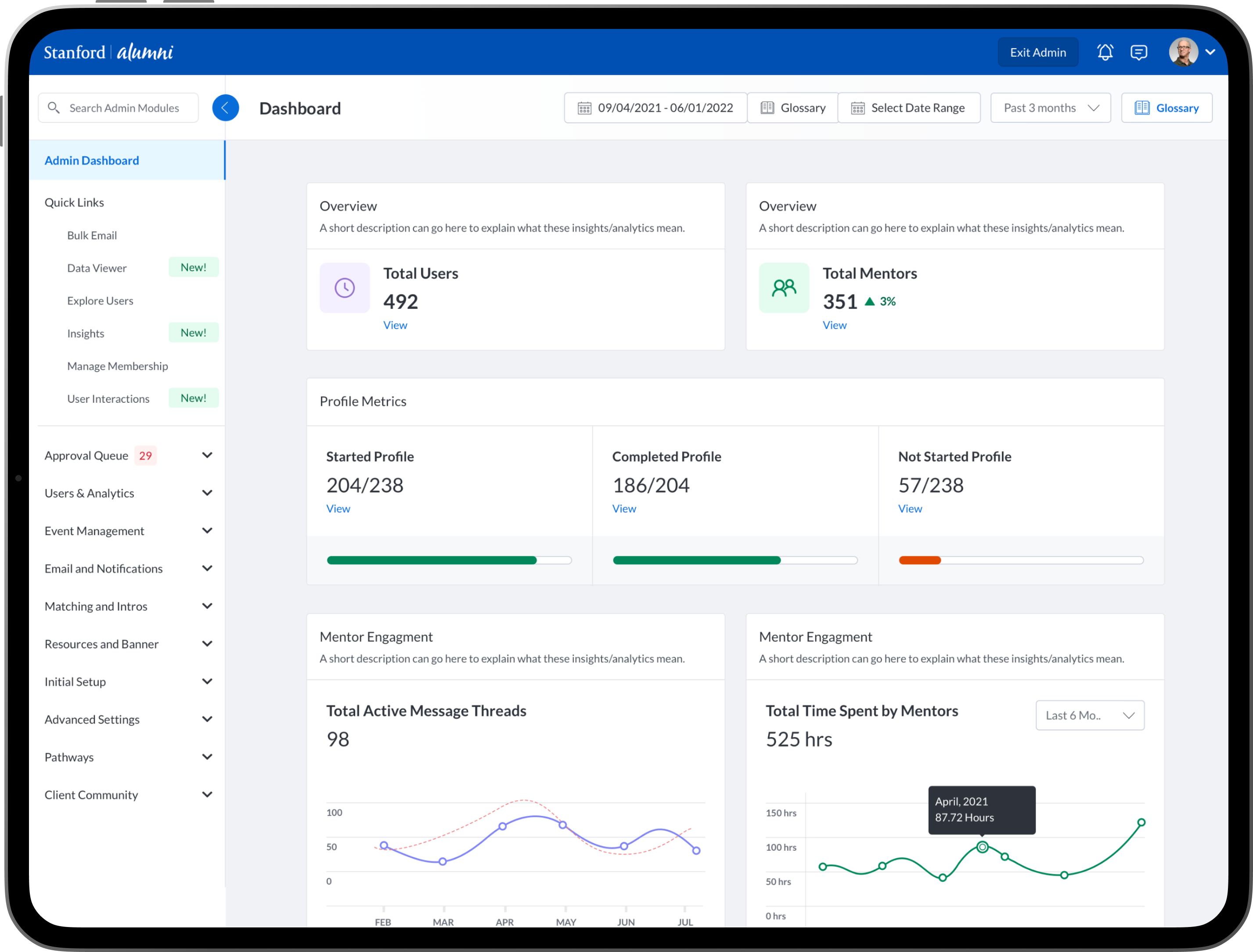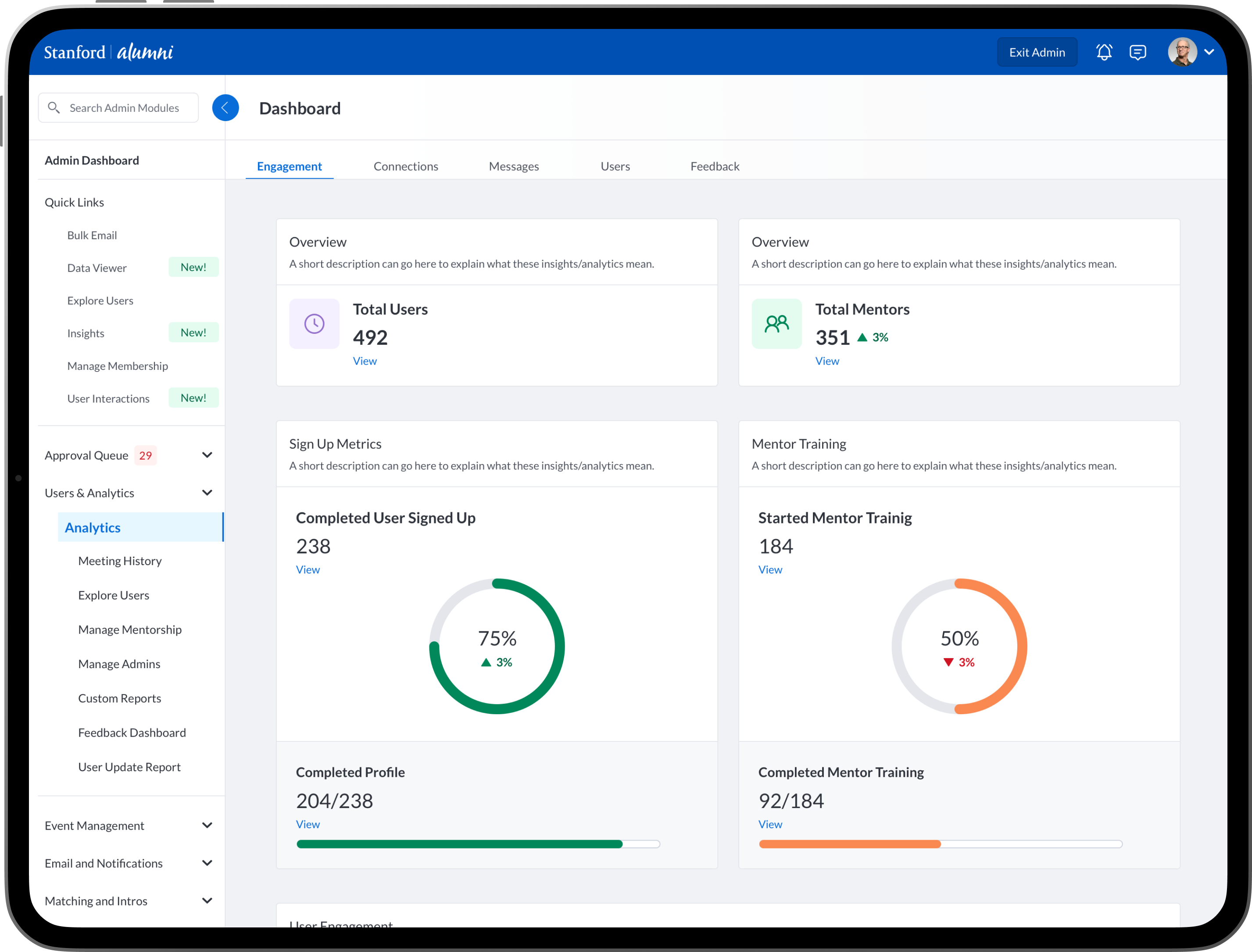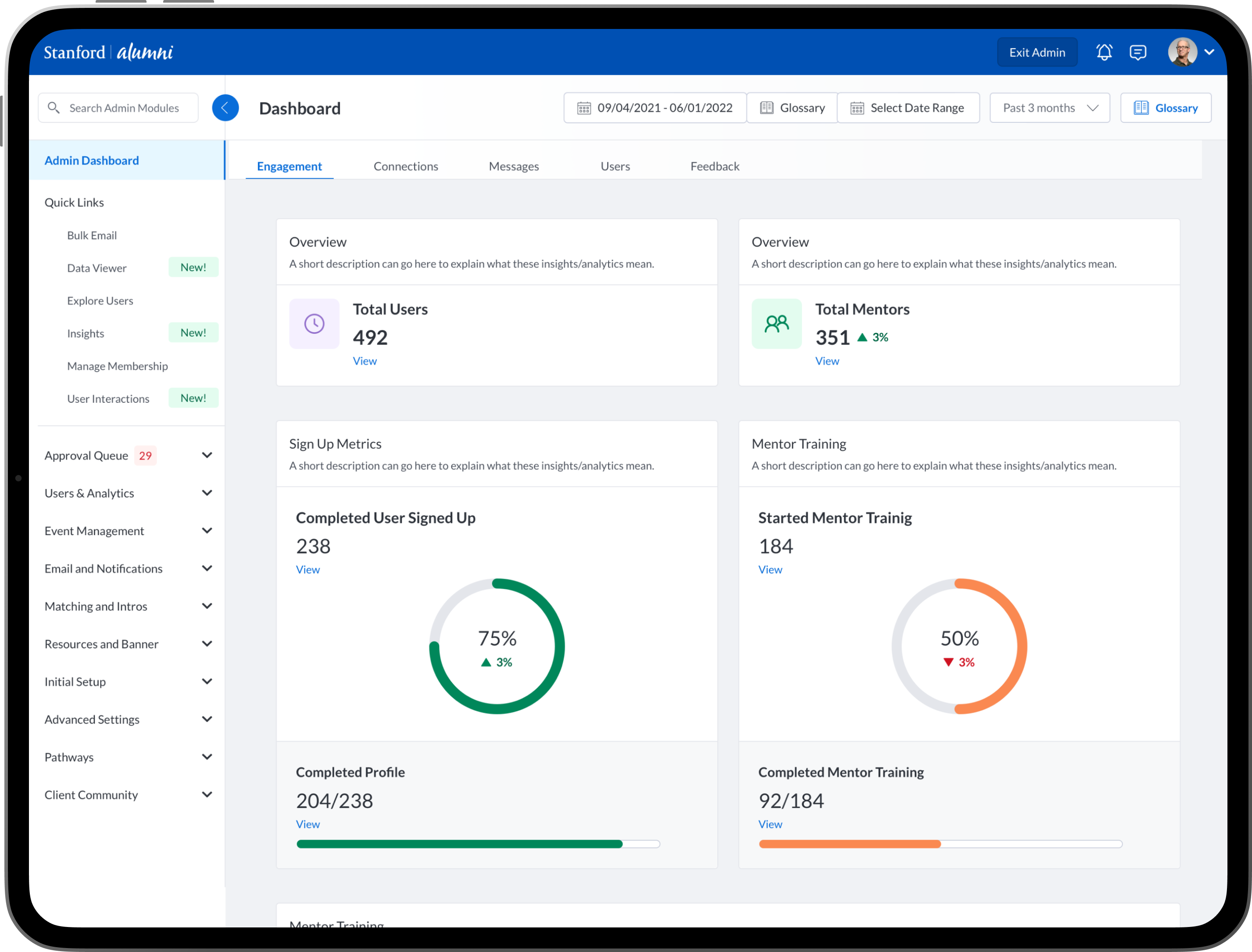 To design new dashboards that provide university/college administrators, advisors, professors, faculty and staff the ability to see insights into community engagement and activity between mentors, mentees, alumni, students, professors and advisors.