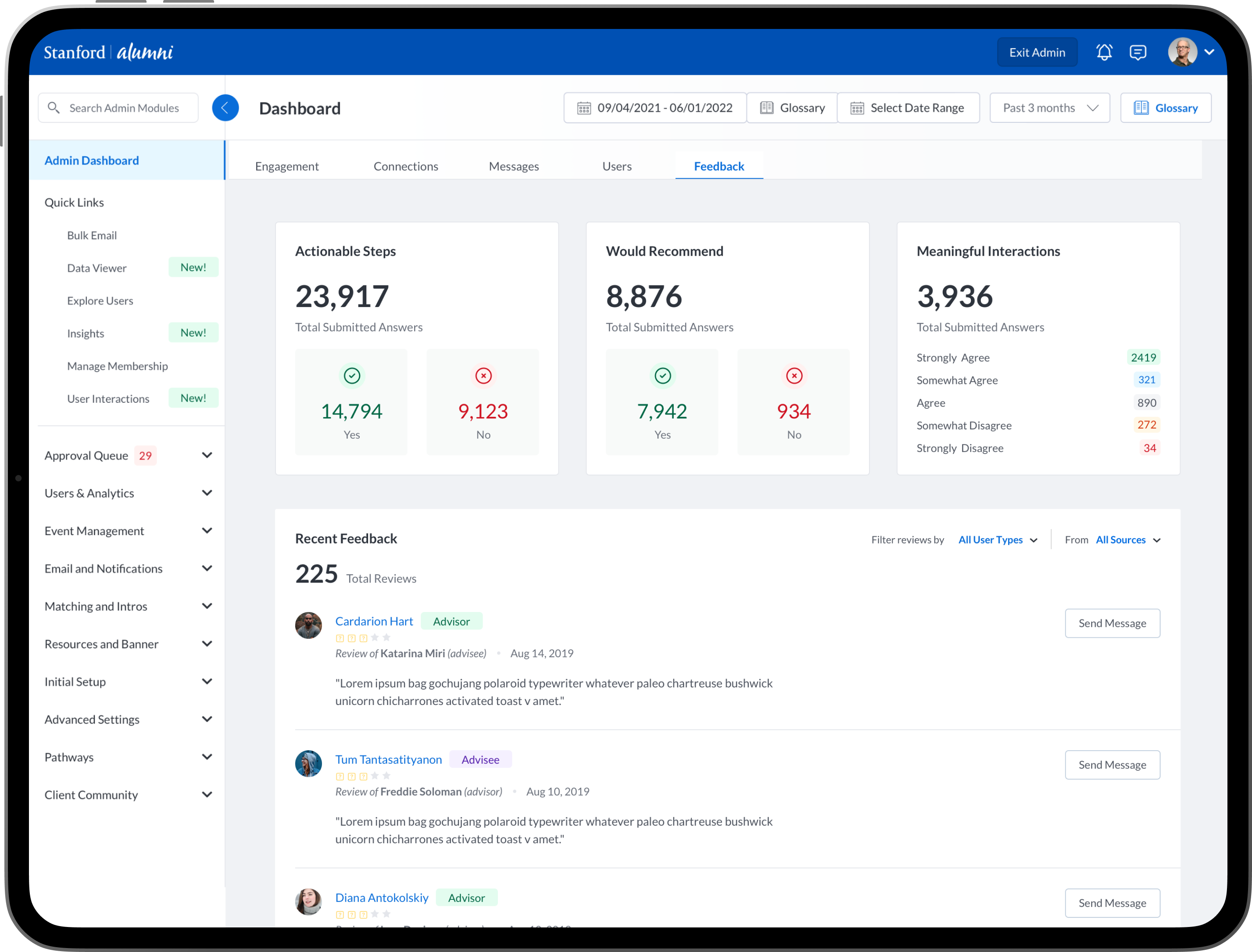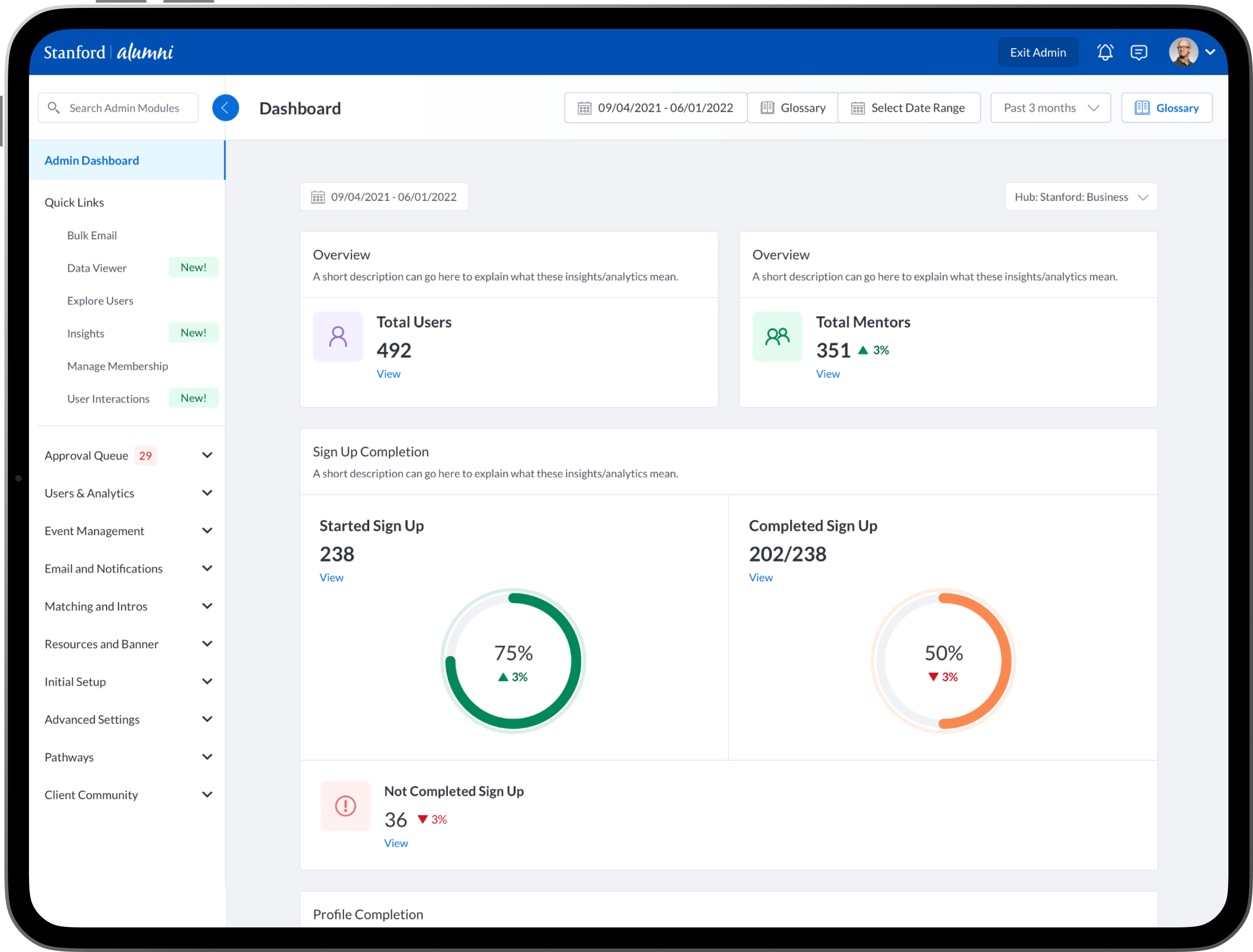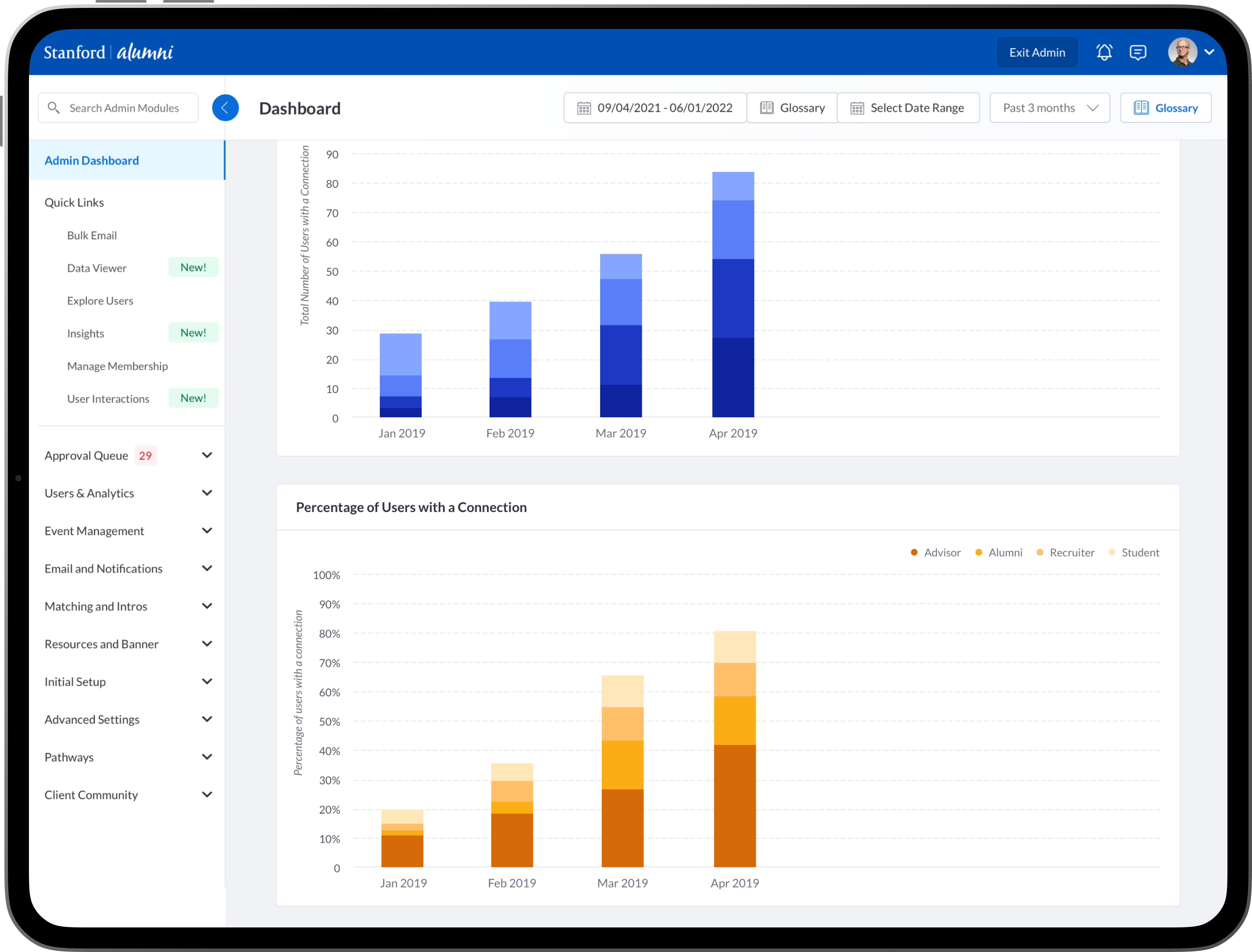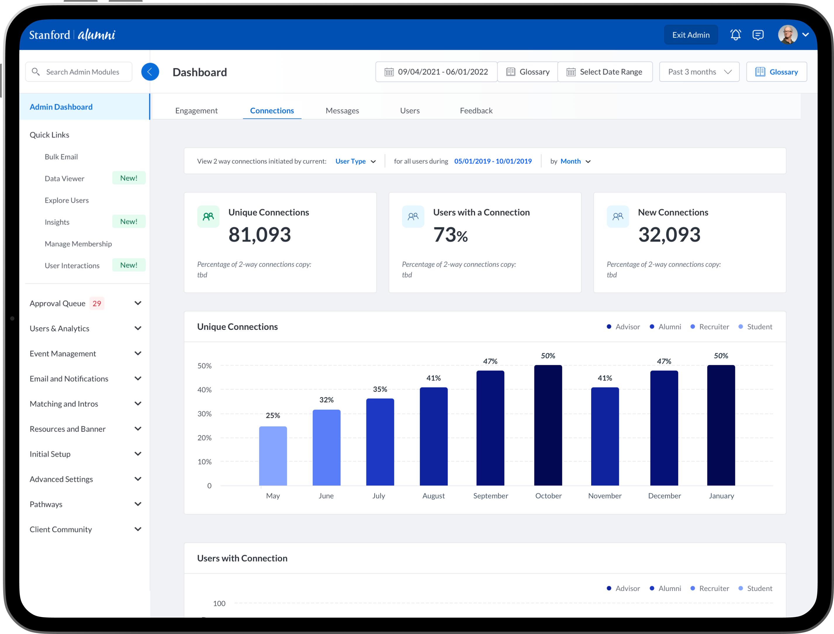 To design new dashboards that provide university/college administrators, advisors, professors, faculty and staff the ability to see insights into community engagement and activity between mentors, mentees, alumni, students, professors and advisors.