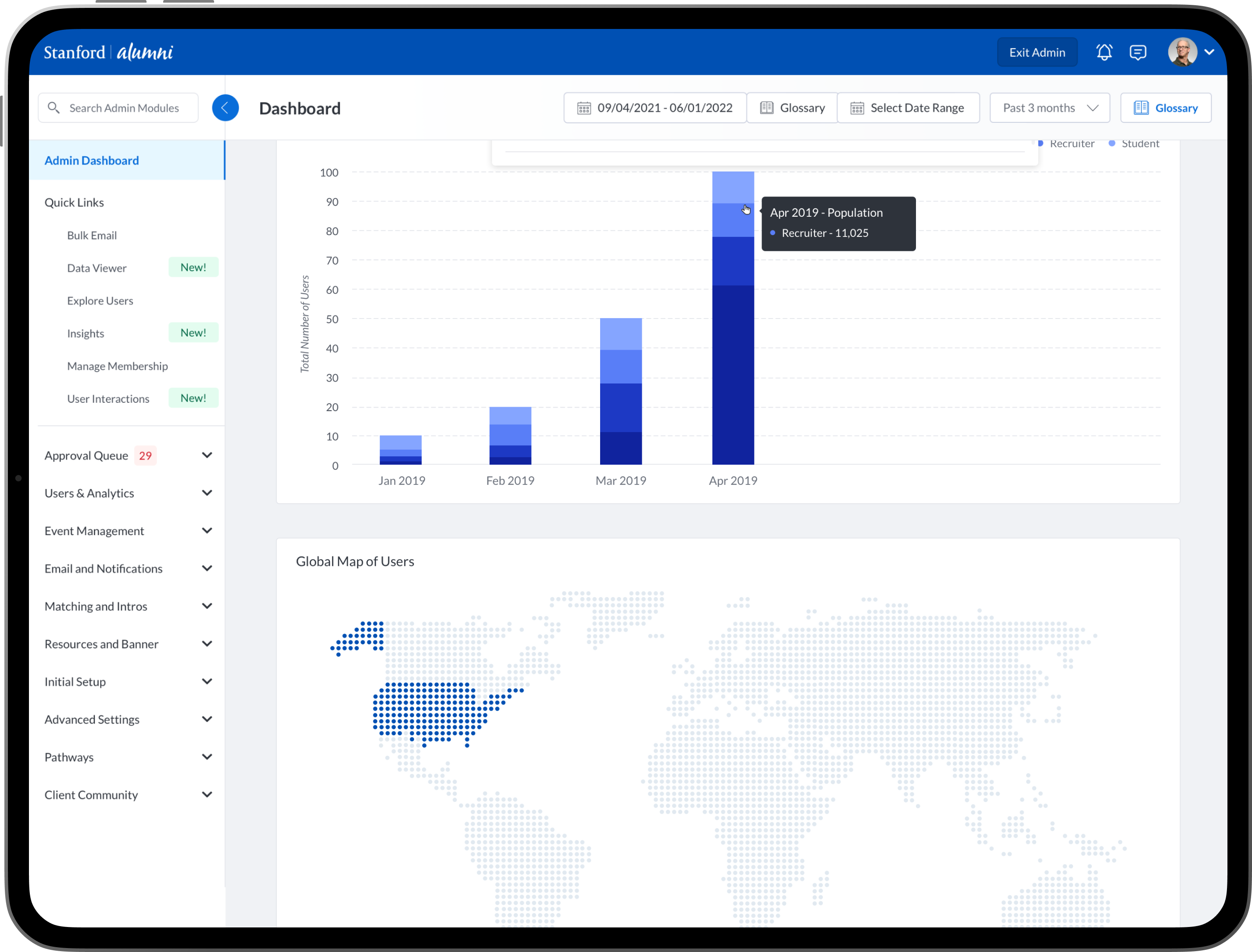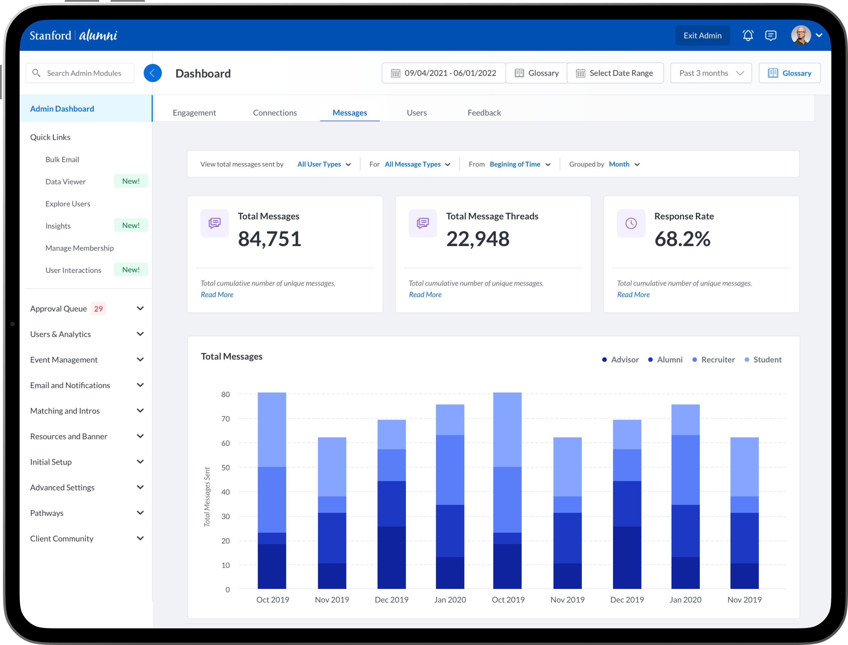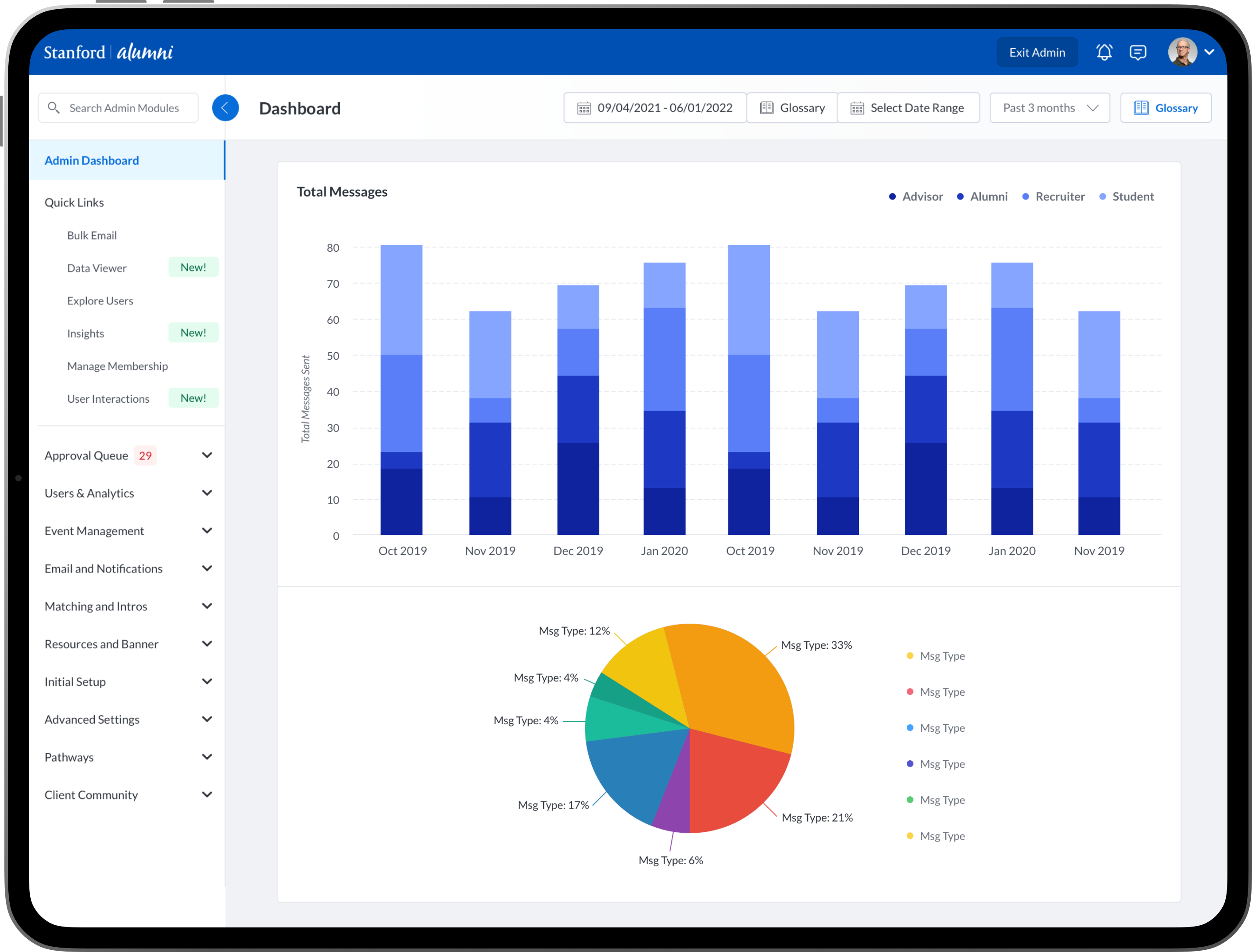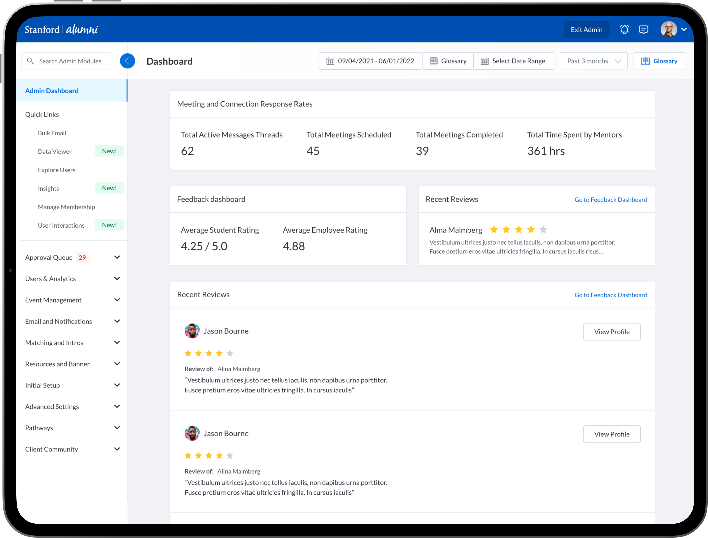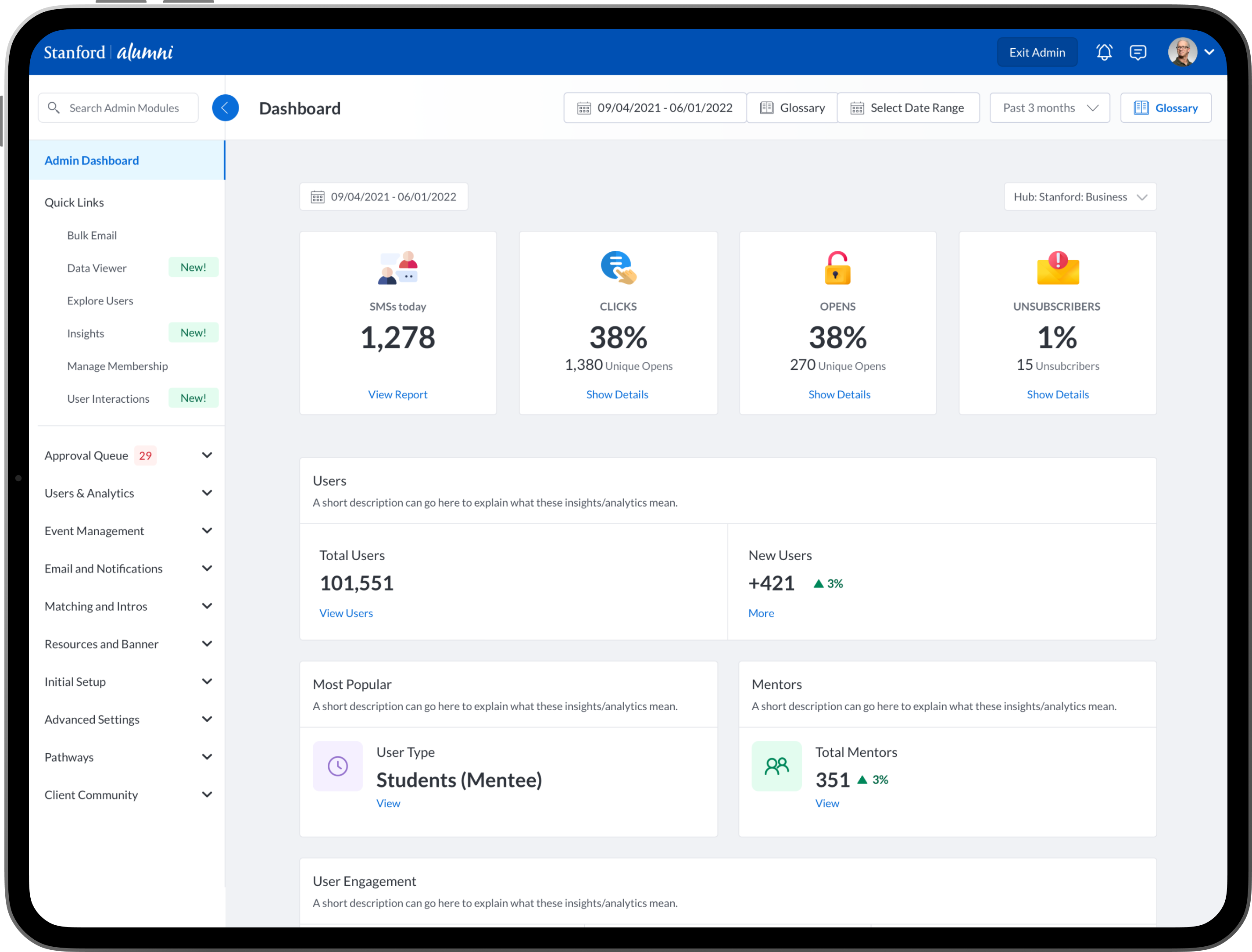 To design new dashboards that provide university/college administrators, advisors, professors, faculty and staff the ability to see insights into community engagement and activity between mentors, mentees, alumni, students, professors and advisors.
